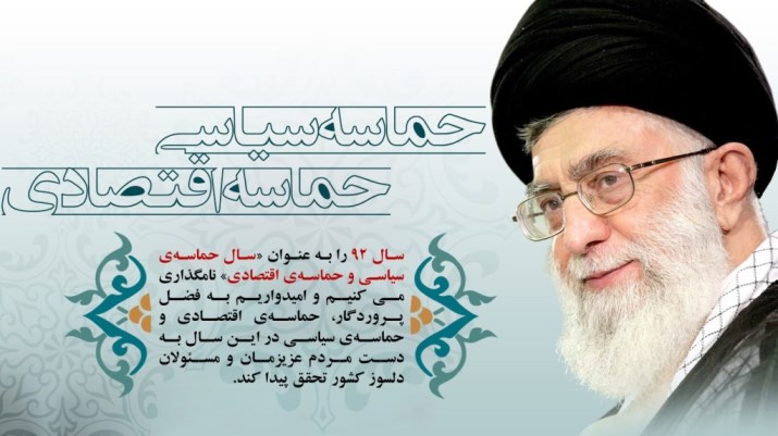 حضرت آیت الله خامنه ای رهبر معظم انقلاب اسلامی در پیام به مناسبت آغاز سال ۱۳۹۲، با اشاره به حرکت رو به جلوی ملت ایران در سال گذشته بویژه در مواجهه ی اقتصادی و سیاسی با جهان استکبار، چشم انداز سال ۹۲ را امیدوارانه و همراه با پیشرفت و تحرک و ورزیدگی و حضور جهادی ملت ایران در عرصه های سیاسی و اقتصادی دانستند و تاکید کردند: با این نگاه، سال ۹۲ را "سال حماسه ی سیاسی و حماسه ی اقتصادی" نامگذاری می کنیم.